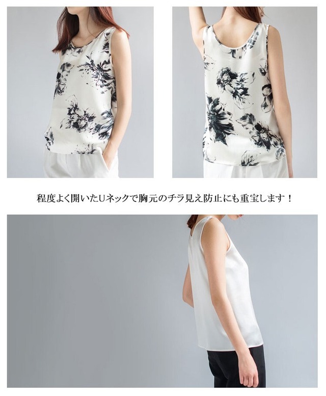 ★特徴:サラッと快適なサテン生地のノースリーブトップス。 程度よく開いたUネックで胸元のチラ見え防止にも重宝します! ふわっと落ち感のあるドレープラインが美しい1枚です。
