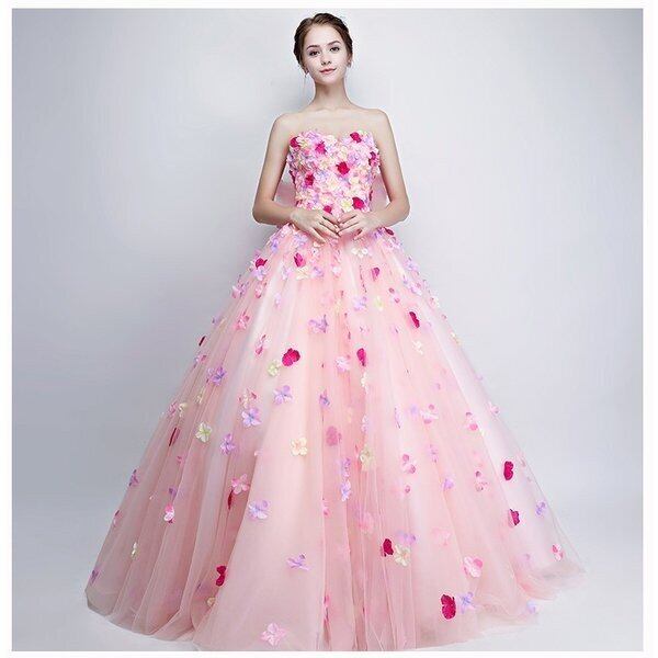 ドレス ロングドレス カラードレス オフショルダー ウエディングドレス 手作り 花刺繍 結婚式 3664
