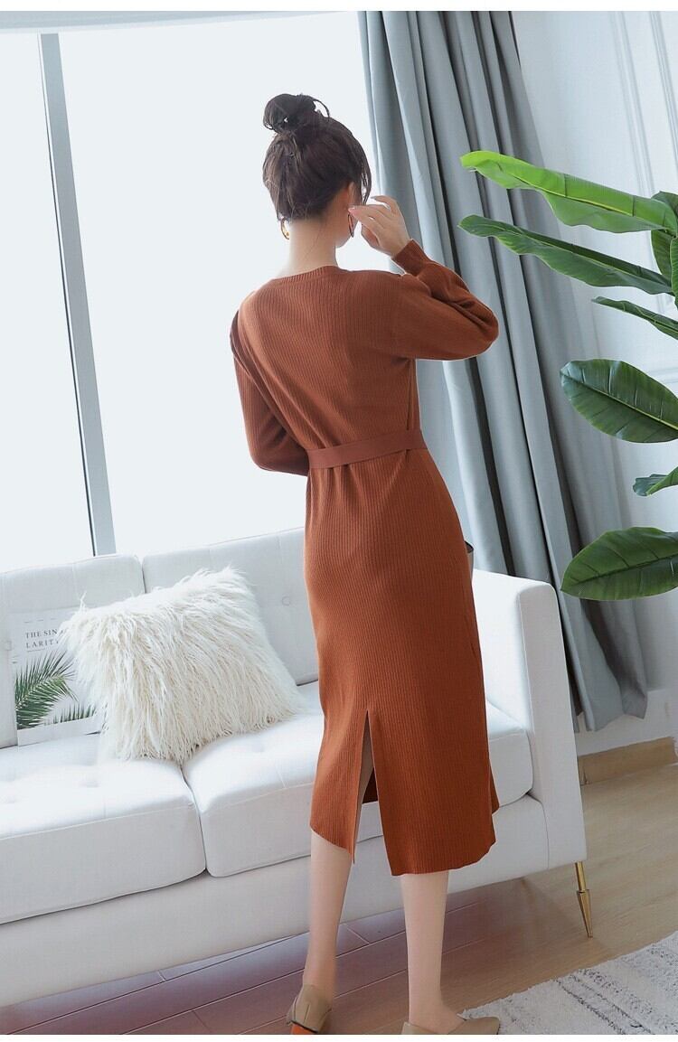 ワンピース ニットワンピース レディース 秋冬 膝丈 長袖 ニット セーター ベルト付き 無地 着痩せ 体型カバー ゆったり お洒落 3715