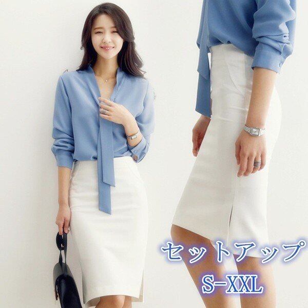 ★商品名:セットアップ シフォンシャツ レディース ブラウス タイトスカート 膝丈 スカート スリット入れ
