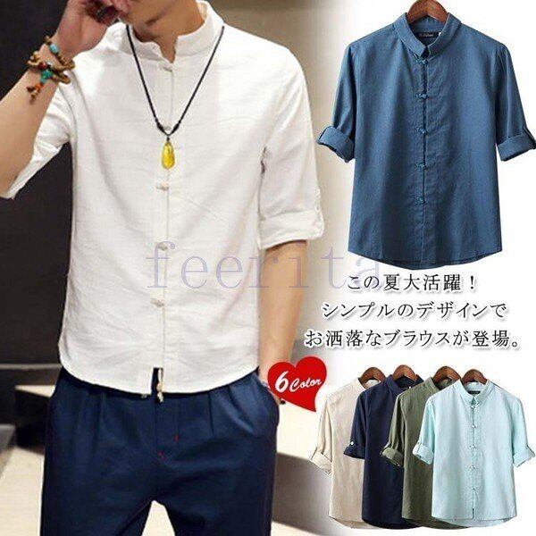 シャツ メンズ 七分袖 リネンシャツ 無地シャツ 綿麻 大きいサイズ 2353