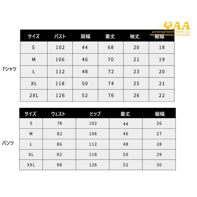 XL:トップス/ バスト118 肩幅50 着丈74 袖丈25 裾幅21 パンツ/ ウエスト92 ヒップ118 着丈50 裾幅29
