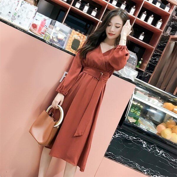 ワンピース レディース 長袖 春秋 ミディアム丈 無地 ベルト付き 韓国 韓国ファッション コーデ おすすめ カジュアル きれいめ 大きいサイズ 人気 ゆったり 20代 30代 40代 50代