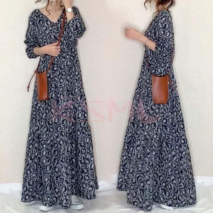 ワンピース レディース 膝丈ワンピース Vネック シフォンワンピ 花柄 ロング丈 5701