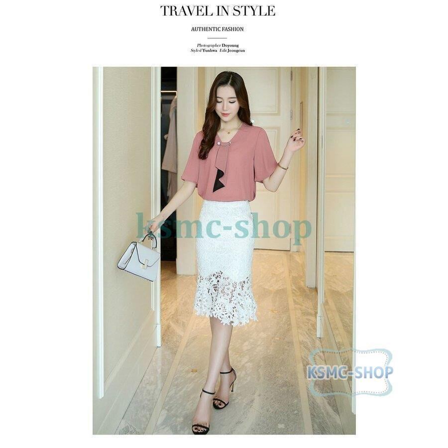 ブラウス シャツ 4色 レディース シフォン 半袖 リボン オフィス 韓国風 5743