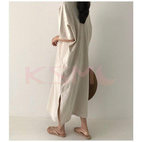 ワンピース レディース リネン Vネック 綿麻 前後Vネック 体型カバー 半袖 ゆったり サイドスリット 韓国 ファッション コーデ おすすめ カジュアル きれいめ 大きいサイズ 人気 ゆったり 20代 30代 40代 50代