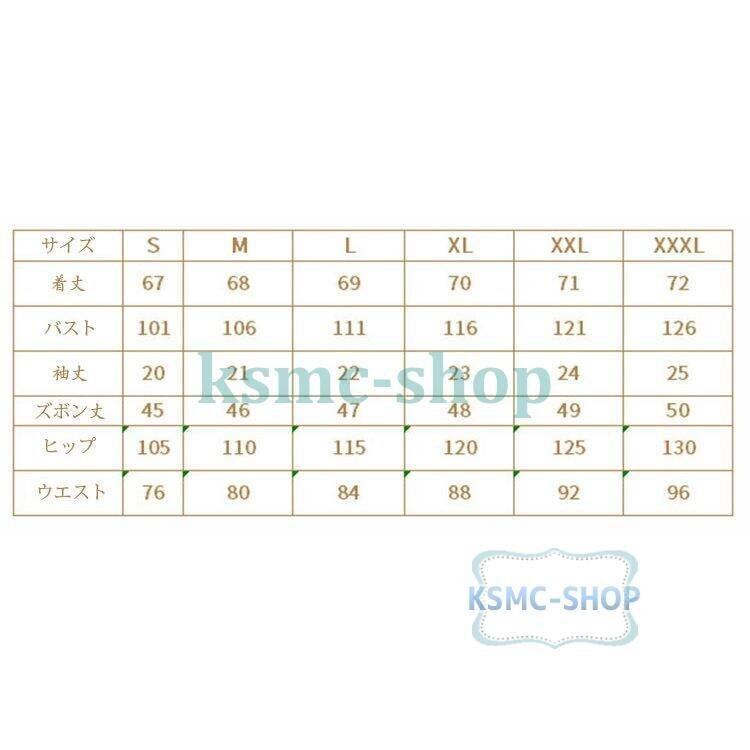 XXXL:着丈72 バスト126 袖丈25 ズボン丈50 ヒップ130 ウエスト96