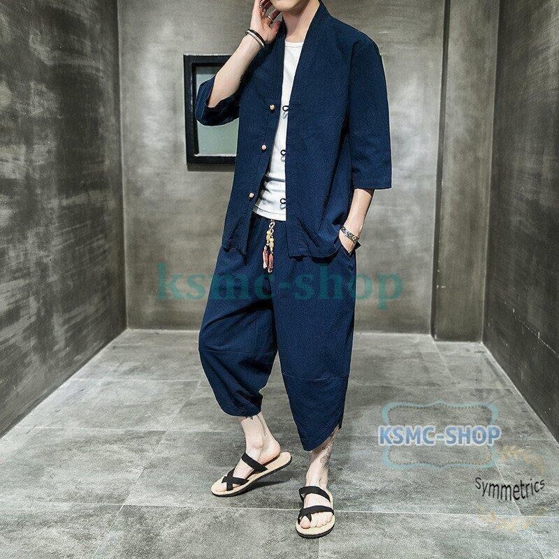 セットアップ メンズ 4色 チャイナ服 リネンジャージ 七分袖 シャツ 上下2点セット サルエルパンツ ゆったり 春夏 5816