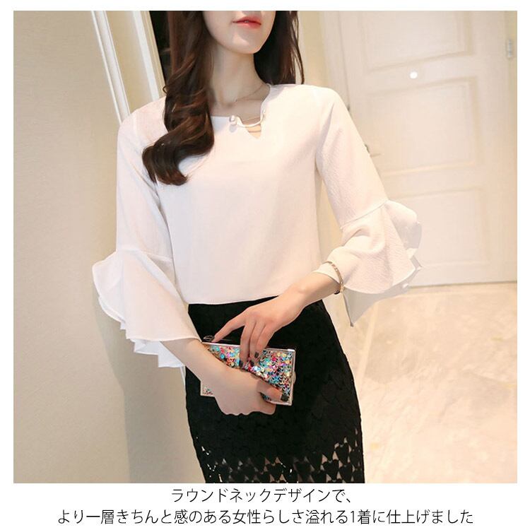 ブラウス レディース シフォンブラウス 五分袖 フレアスリーブ Uネック プルオーバー 韓国 ファッション コーデ おすすめ カジュアル きれいめ 大きいサイズ 人気 ゆったり 20代 30代 40代 50代