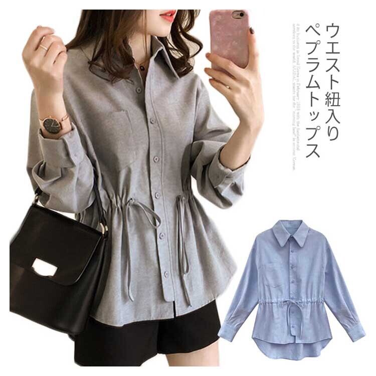 ブラウス シャツ ペプラムトップス ウエスト紐 チュニック 長袖 襟付き レディース トップス 韓国 ファッション コーデ おすすめ カジュアル きれいめ 大きいサイズ 人気 ゆったり 20代 30代 40代 50代