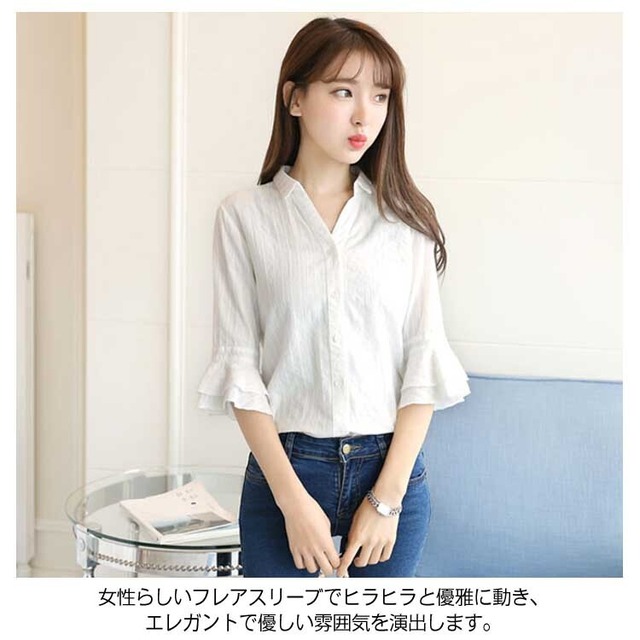 ブラウス シャツ 七分袖 レディース フレア袖 Vネック ホワイト 綿 フレアスリーブ 韓国 ファッション コーデ おすすめ カジュアル きれいめ 大きいサイズ 人気 ゆったり 20代 30代 40代 50代