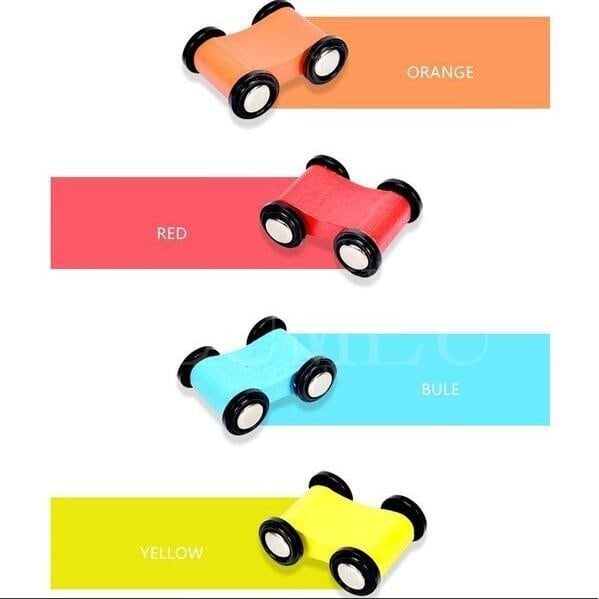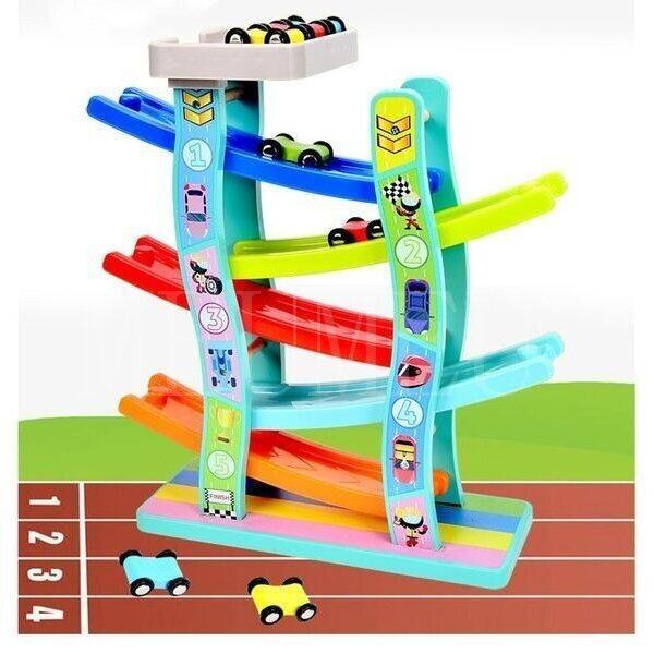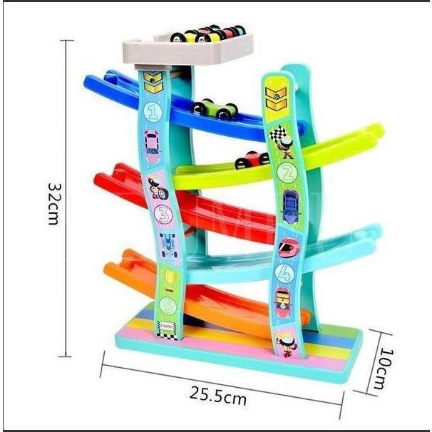 プラスチックと高品質の木材と水性塗料で作られた車で遊ぶスロープおもちゃ。