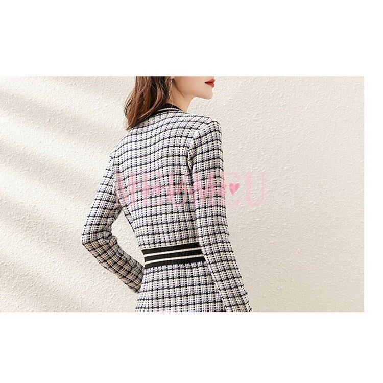 ワンピース ニットワンピース レディース 膝丈 秋冬 チェック柄 Vネック 6292