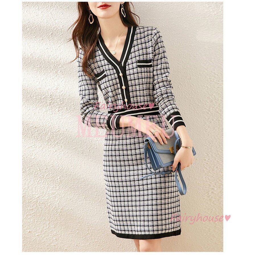 ワンピース ニットワンピース レディース 膝丈 秋冬 チェック柄 Vネック 韓国 ファッション コーデ おすすめ カジュアル きれいめ 大きいサイズ 人気 ゆったり 20代 30代 40代 50代