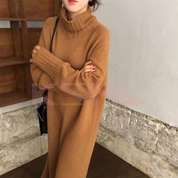 ★特徴:秋冬におすすめのニットワンピース。ハイネックで首元まで暖かい。ゆったりシルエットで体系カバー効果も。