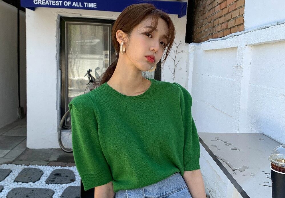 ニット 5部袖 ニットトップス レディース パフスリーブ グリーン 韓国ファッション 韓国 ファッション コーデ おすすめ カジュアル きれいめ 大きいサイズ 人気 ゆったり 20代 30代 40代 50代