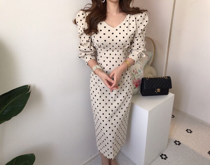 ワンピース レディース 2色 Vネック 水玉 パフスリーブ 韓国ファッション 6539a