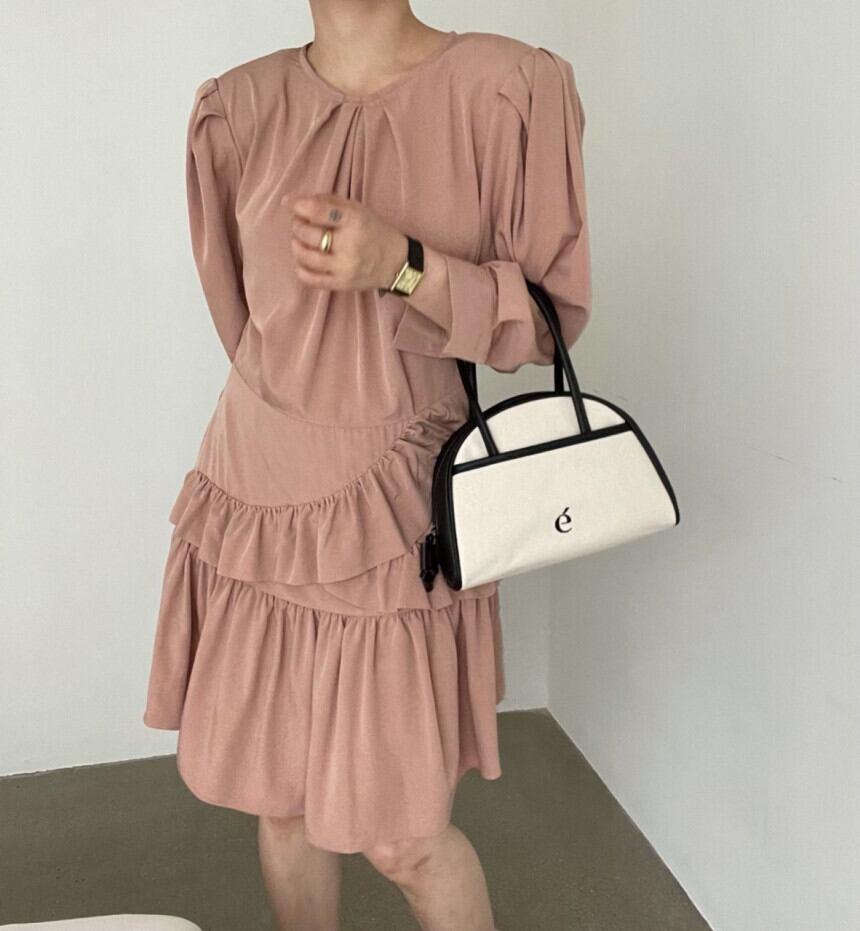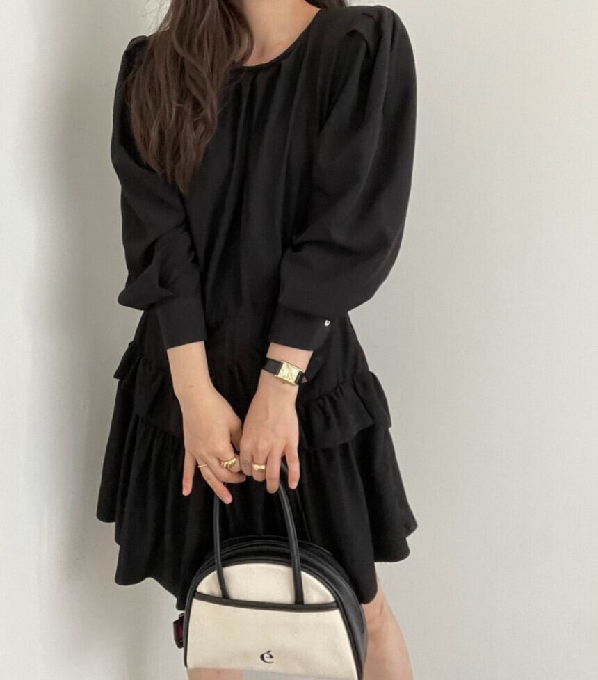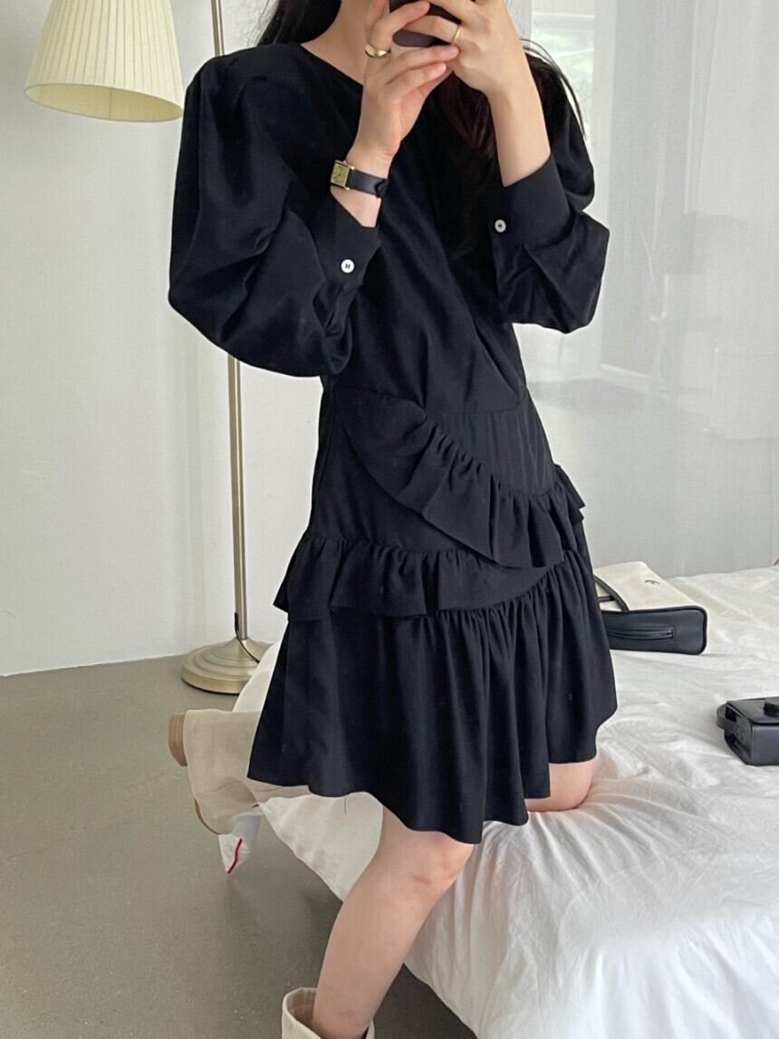 ワンピース レディース 2色 長袖 ラウンドネック フリル パフスリーブ 韓国系 韓国 ファッション コーデ おすすめ カジュアル きれいめ 大きいサイズ 人気 ゆったり 20代 30代 40代 50代