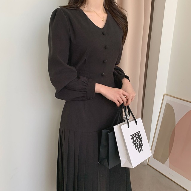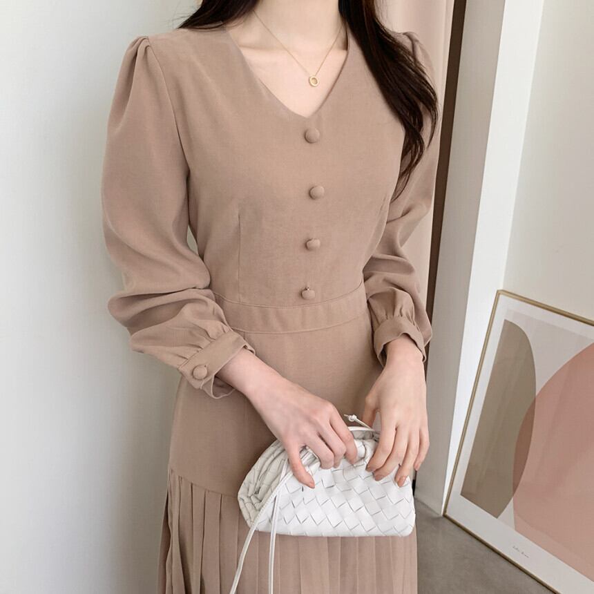 ワンピース レディース 2色 長袖 Vネック プリーツスカート ロング丈 韓国系 1057a