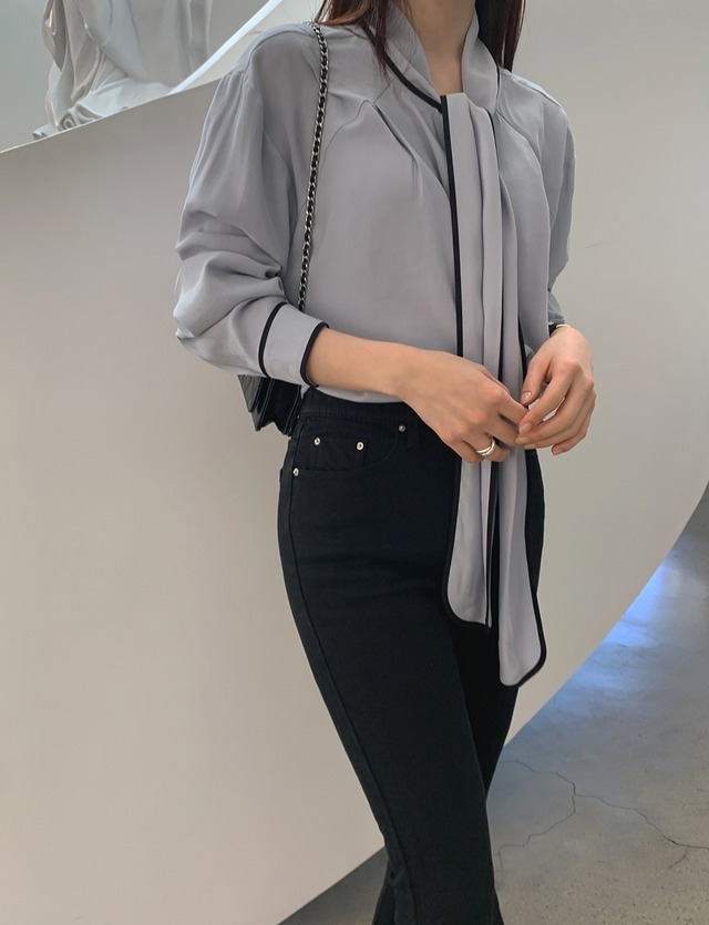 ブラウス シャツ レディース グレー 長袖 パフスリーブ ネクタイ付き 韓国系 1060a