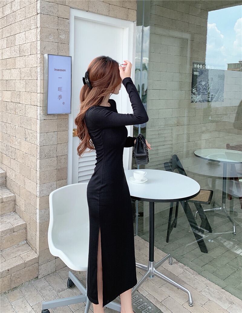 ワンピース レディース 2色 長袖 クルーネック スリット きれいめ タイト 韓国 ファッション コーデ おすすめ カジュアル きれいめ 大きいサイズ 人気 ゆったり 20代 30代 40代 50代