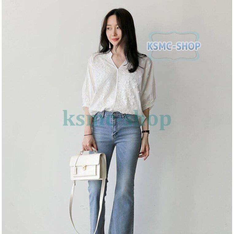 ブラウス シャツ 五分袖 レディース 白 Vネック きれいめ 春夏 大人 韓国風 6787