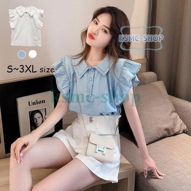 ブラウス シャツ 半袖 レディース 2色 フリル 白 春夏 韓国風 韓国 ファッション コーデ おすすめ カジュアル きれいめ 大きいサイズ 人気 ゆったり 20代 30代 40代 50代