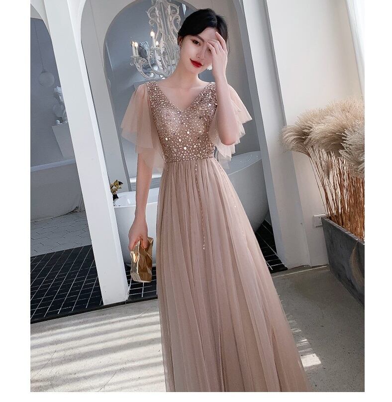 ワンピース ドレス レディース シャンパン Vネック パーティードレス ロングドレス 結婚式 二次会ドレス 1444a
