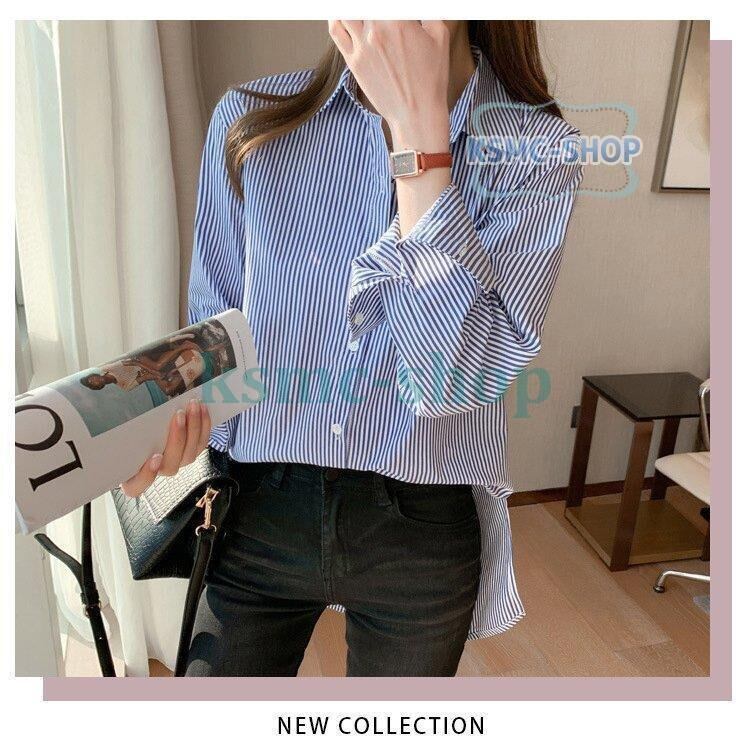 ブラウス シャツ レディース 長袖 ブルー ストライプ きれいめ オフィス 韓国風 韓国 ファッション コーデ おすすめ カジュアル きれいめ 大きいサイズ 人気 ゆったり 20代 30代 40代 50代