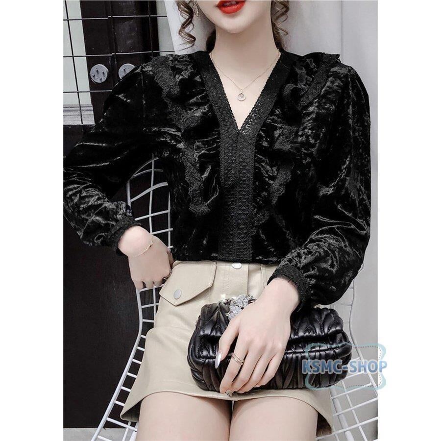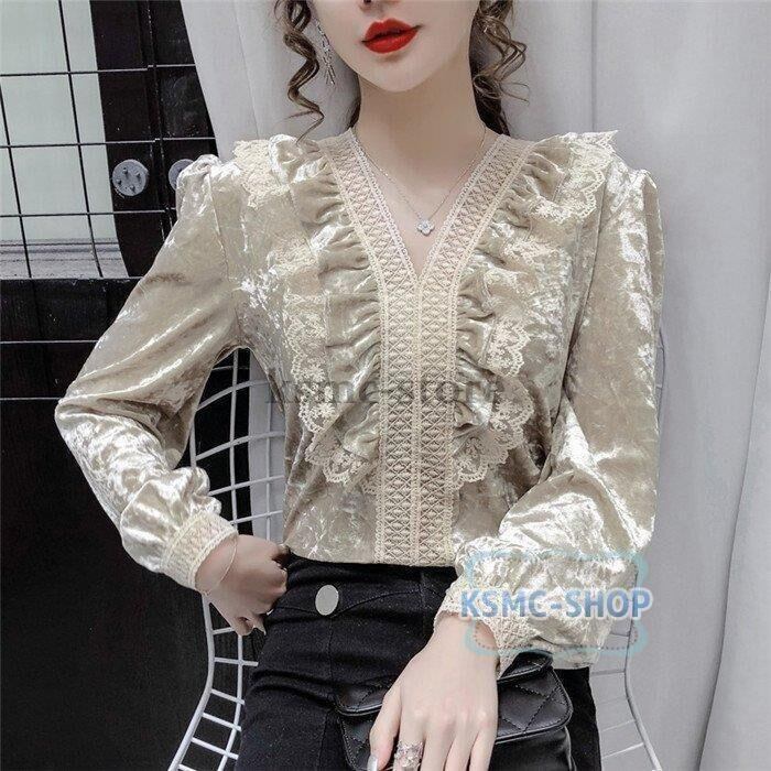 ブラウス シャツ レディース 長袖 3色 ベロア Vネック おしゃれ きれいめ 韓国風 6853