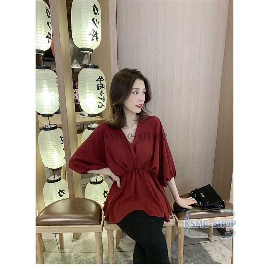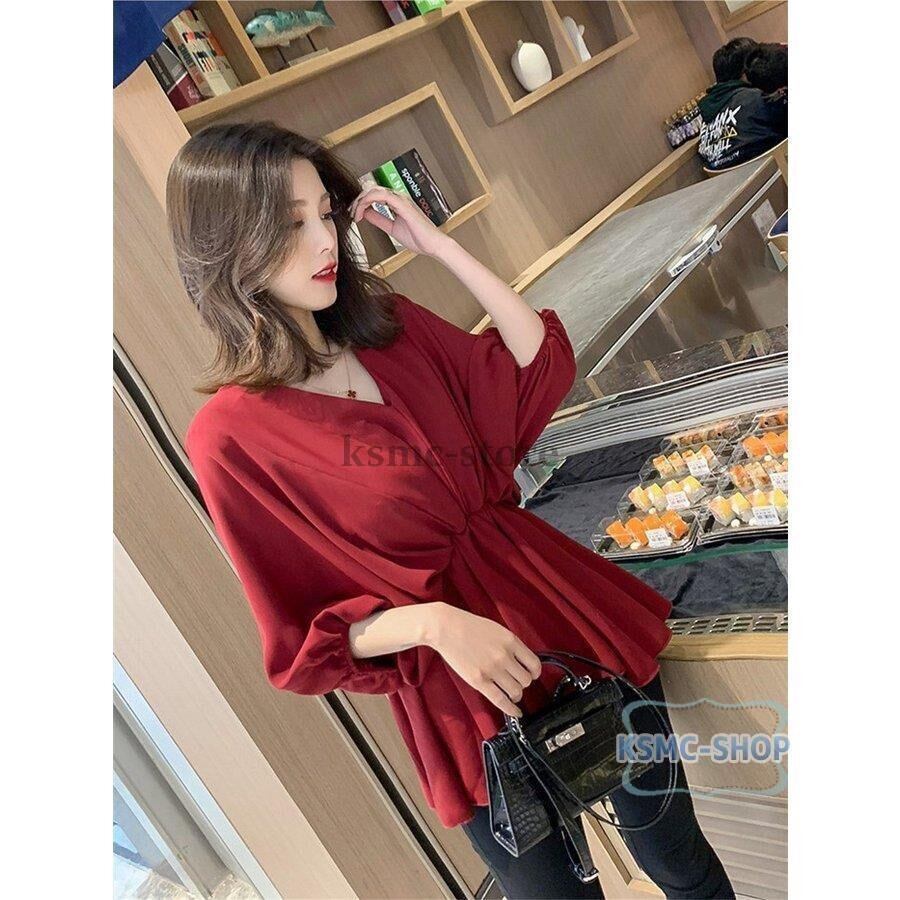 ブラウス シャツ レディース 3色 長袖 Vネック 七分袖 パフスリーブ おしゃれ きれいめ 韓国風 6892