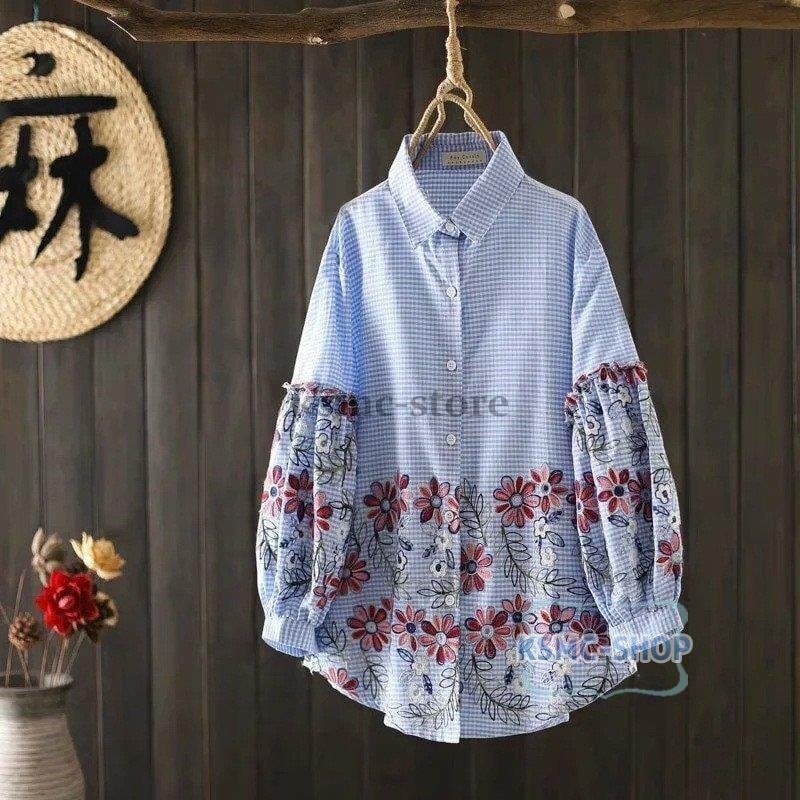 ブラウス シャツ レディース 長袖 2色 刺繍 花柄 コットン カジュアル 韓国風 6933