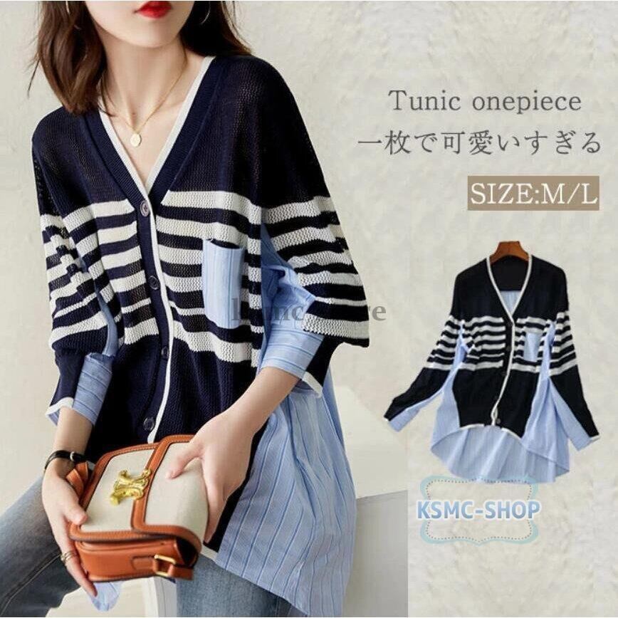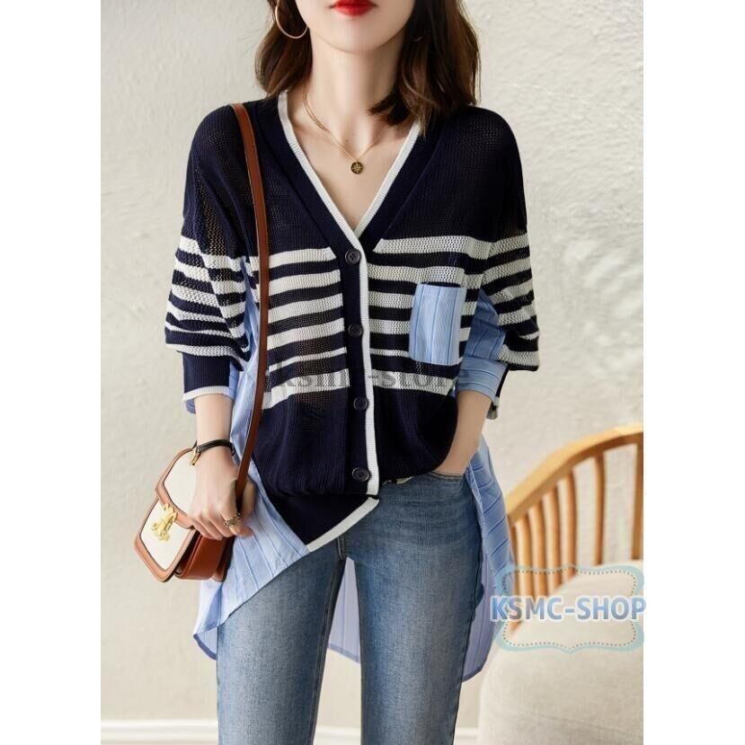 ブラウス シャツ カーディガン レディース 長袖 ネイビー 切替え おしゃれ 韓国風 6947