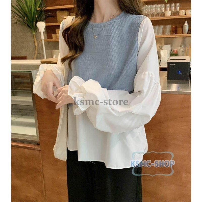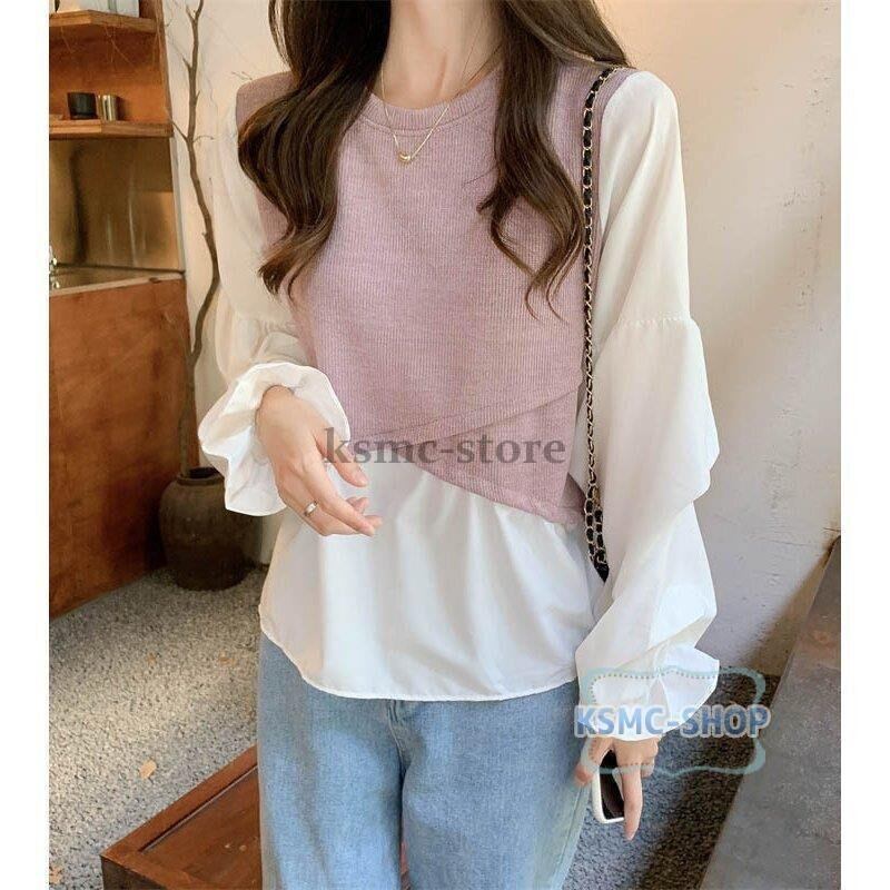 ブラウス シャツ レディース 長袖 3色 ニット 綿 レイヤード風 カジュアル 韓国風 7039