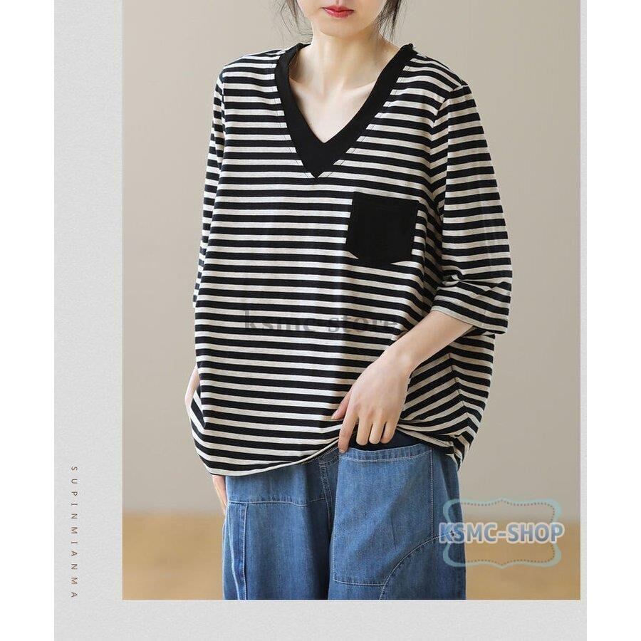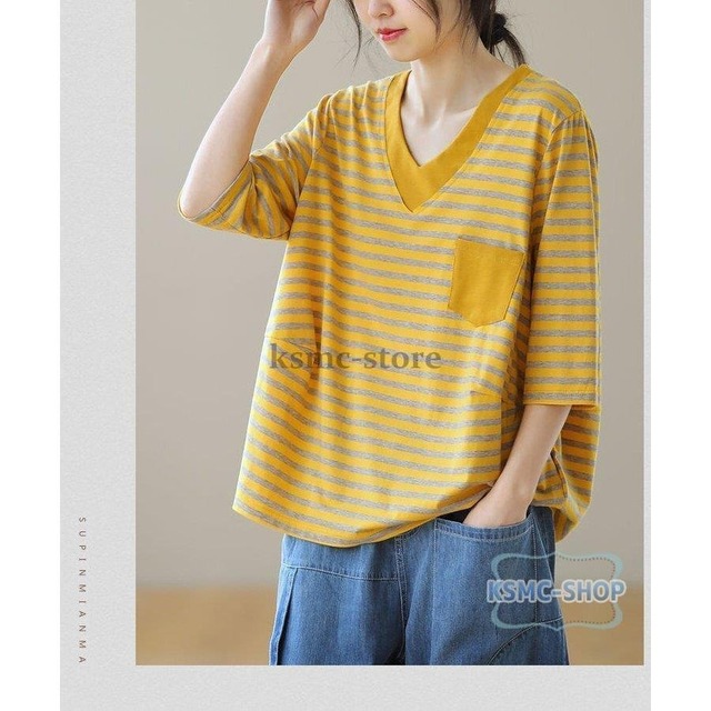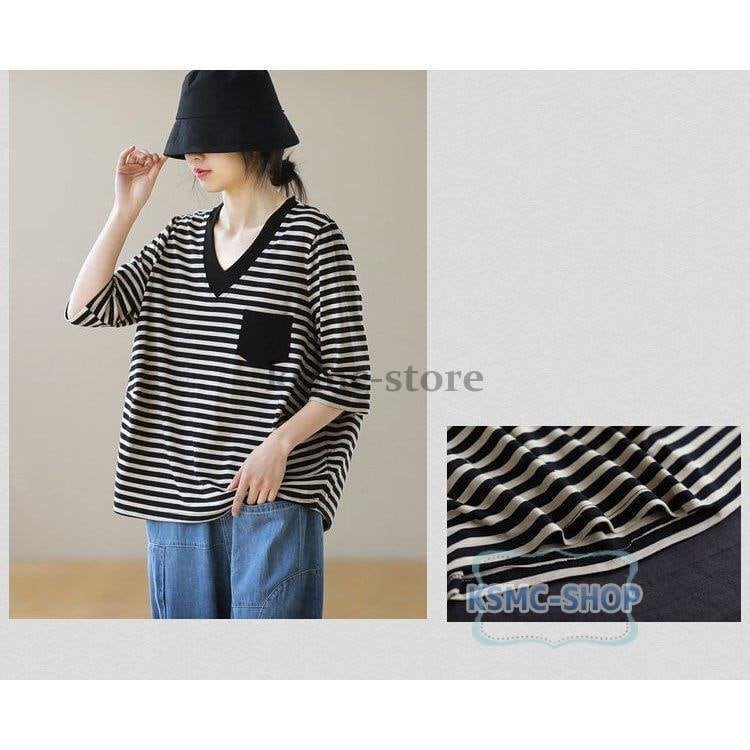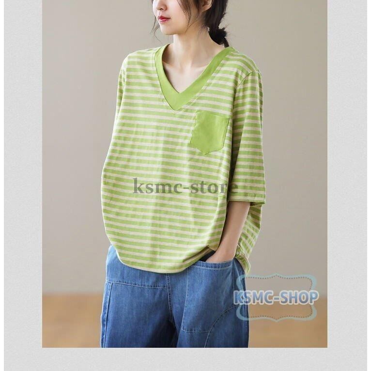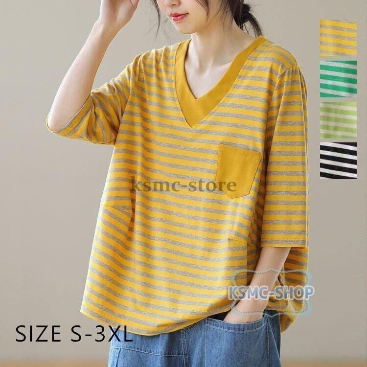 tシャツ カットソー レディース 半袖 4色 Vネック ボーダー カジュアル 韓国風 韓国 ファッション コーデ おすすめ カジュアル きれいめ 大きいサイズ 人気 ゆったり 20代 30代 40代 50代