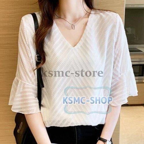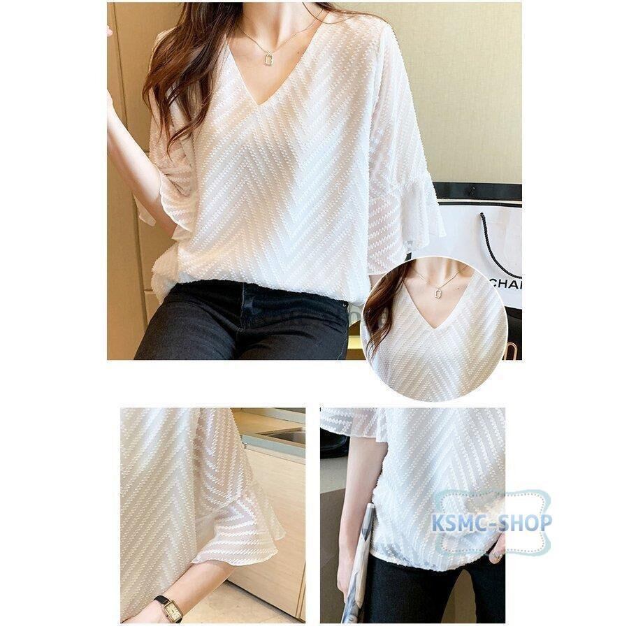 ブラウス シャツ レディース 五分袖 白 Vネック シフォン フレア 韓国風 韓国 ファッション コーデ おすすめ カジュアル きれいめ 大きいサイズ 人気 ゆったり 20代 30代 40代 50代