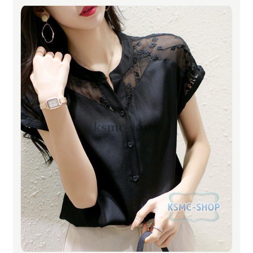 ブラウス シャツ レディース 2色 半袖 白 レース オフィス 韓国風 韓国 ファッション コーデ おすすめ カジュアル きれいめ 大きいサイズ 人気 ゆったり 20代 30代 40代 50代