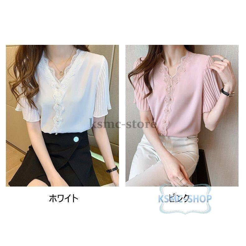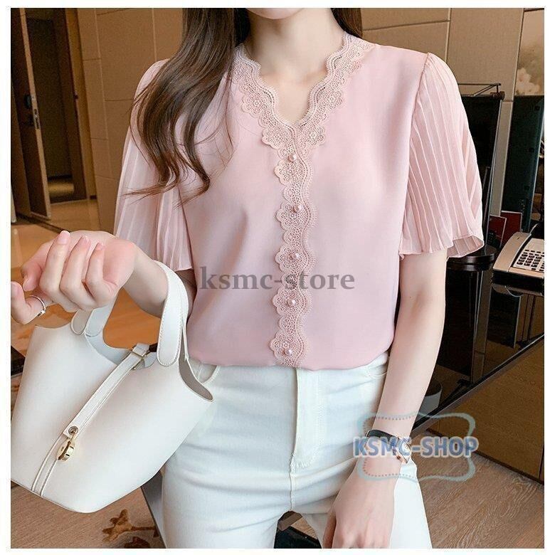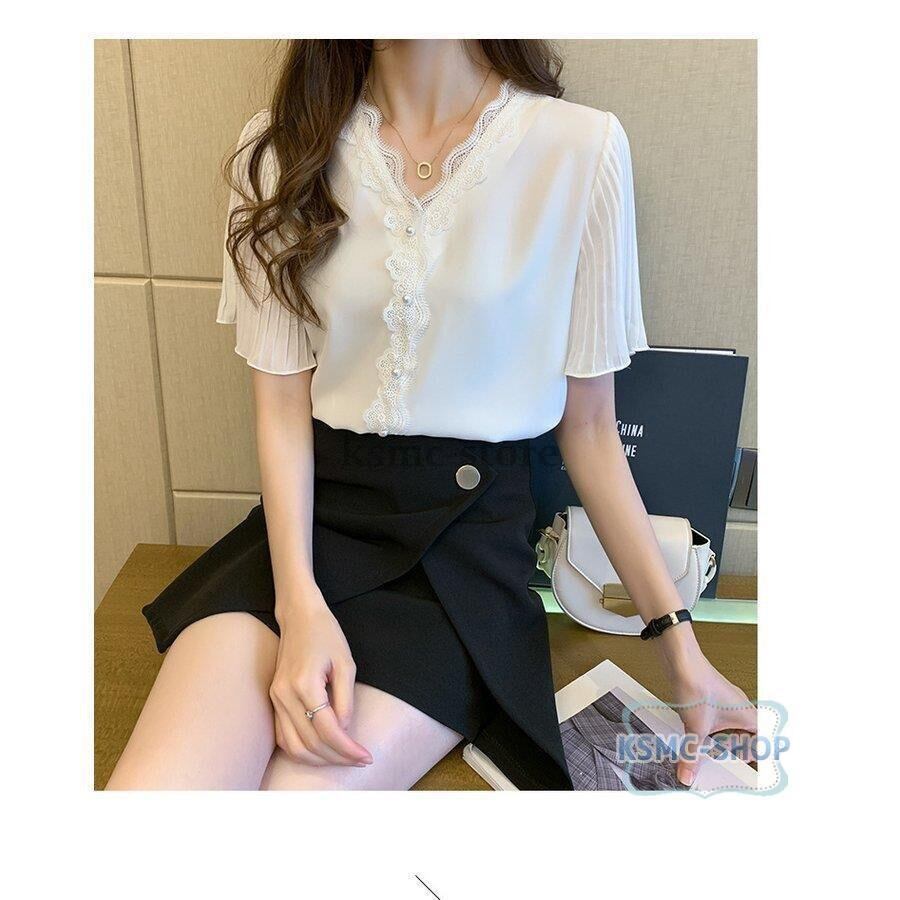 ブラウス シャツ レディース 半袖 2色 Vネック シフォンブラウス レース 韓国風 韓国 ファッション コーデ おすすめ カジュアル きれいめ 大きいサイズ 人気 ゆったり 20代 30代 40代 50代