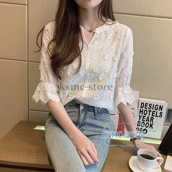 ブラウス シャツ レディース 五分袖 Vネック 花柄 レース 韓国風 韓国 ファッション コーデ おすすめ カジュアル きれいめ 大きいサイズ 人気 ゆったり 20代 30代 40代 50代