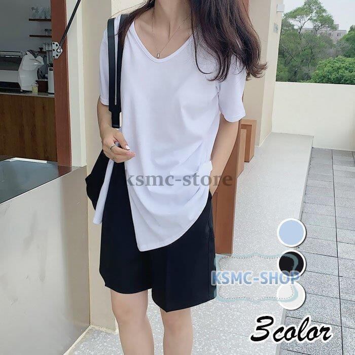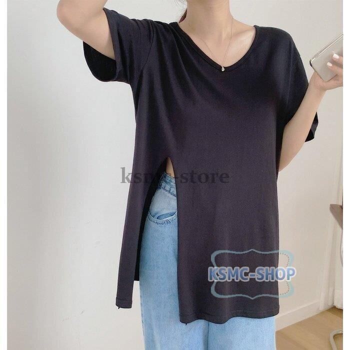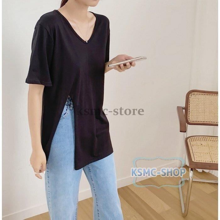 tシャツ トップス レディース 半袖 3色 Vネック スリット 韓国風 韓国 ファッション コーデ おすすめ カジュアル きれいめ 大きいサイズ 人気 ゆったり 20代 30代 40代 50代
