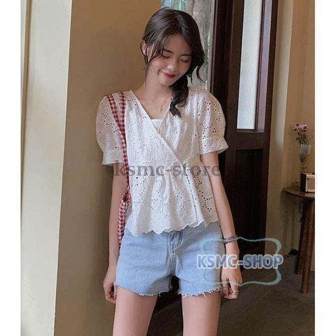 シャツ ブラウス レディース 半袖 白 Vネック ペプラム 透け感 韓国風 7098