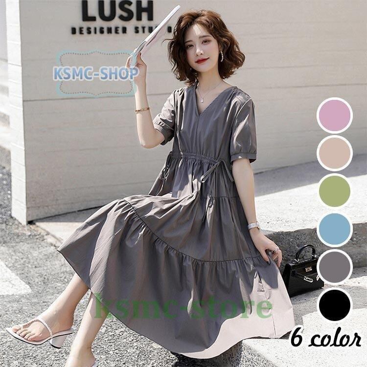 ワンピース レディース 6色 半袖 Vネック Aライン マキシワンピース 韓国風 韓国 ファッション コーデ おすすめ カジュアル きれいめ 大きいサイズ 人気 ゆったり 20代 30代 40代 50代