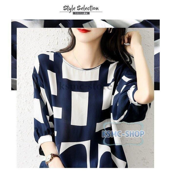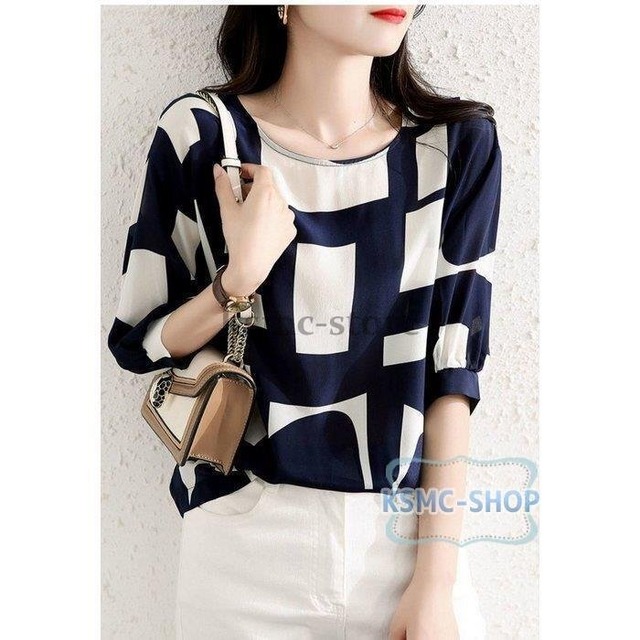 ブラウス シャツ レディース ネイビー 5分袖 シフォン パフスリーブ 韓国風 7297