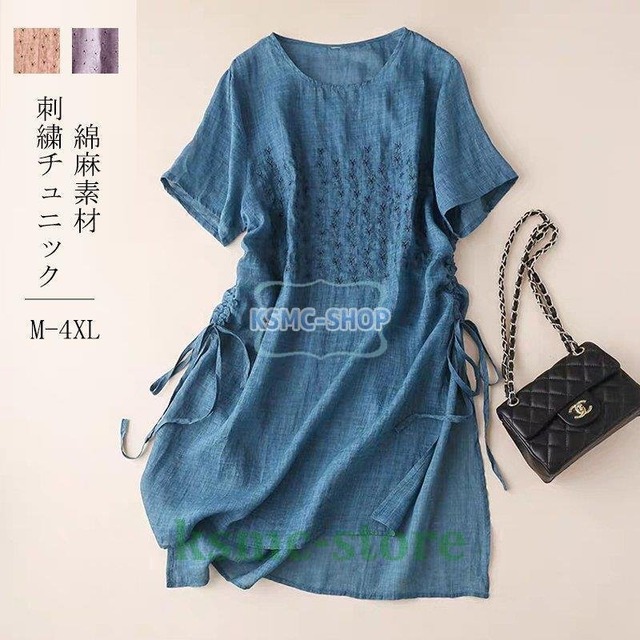 チュニック ワンピース レディース 3色 半袖 刺繍 綿麻 ゆったり 韓国風 韓国 ファッション コーデ おすすめ カジュアル きれいめ 大きいサイズ 人気 ゆったり 20代 30代 40代 50代