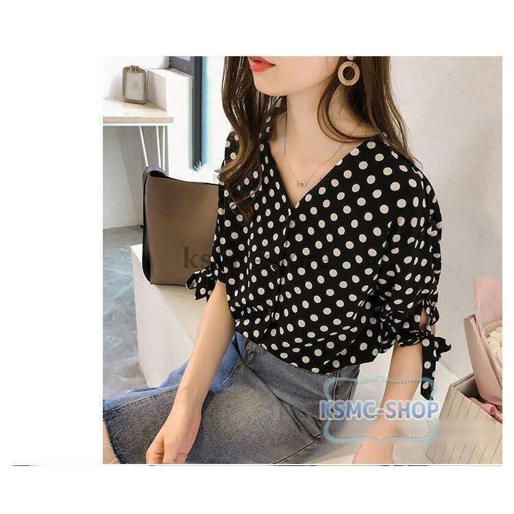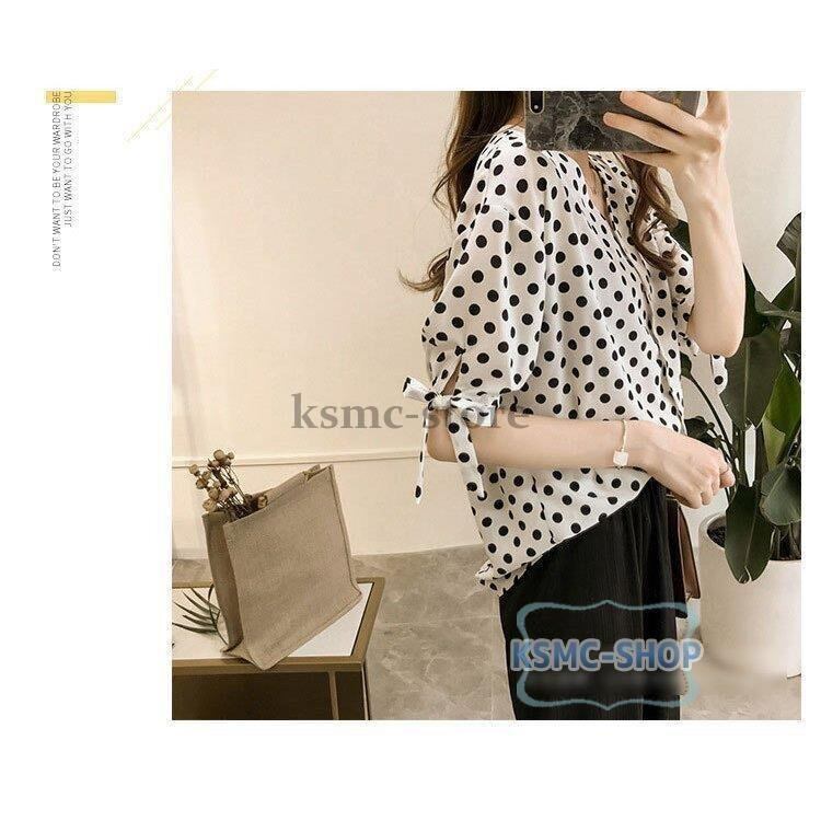 ブラウス シャツ レディース 半袖 2色 水玉 Vネック ドット柄 韓国風 韓国 ファッション コーデ おすすめ カジュアル きれいめ 大きいサイズ 人気 ゆったり 20代 30代 40代 50代