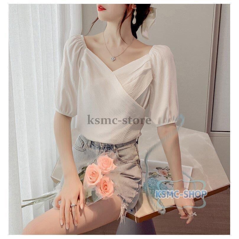 ブラウス シャツ レディース 白 半袖 Vネック きれいめ 大人 韓国風 韓国 ファッション コーデ おすすめ カジュアル きれいめ 大きいサイズ 人気 ゆったり 20代 30代 40代 50代