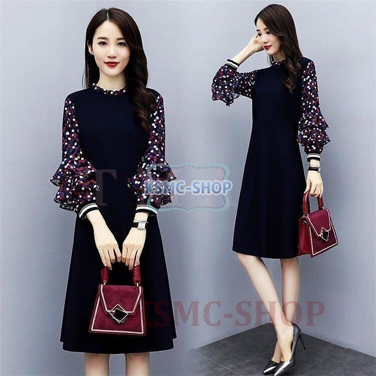 ワンピース 膝丈 レディース 長袖 きれいめ 上品 結婚式 韓国風 7330
