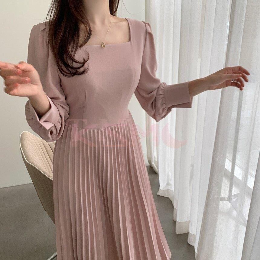 ワンピース 無地 レディース 長袖 2色 ロングワンピース きれいめ フレア 韓国風 7346