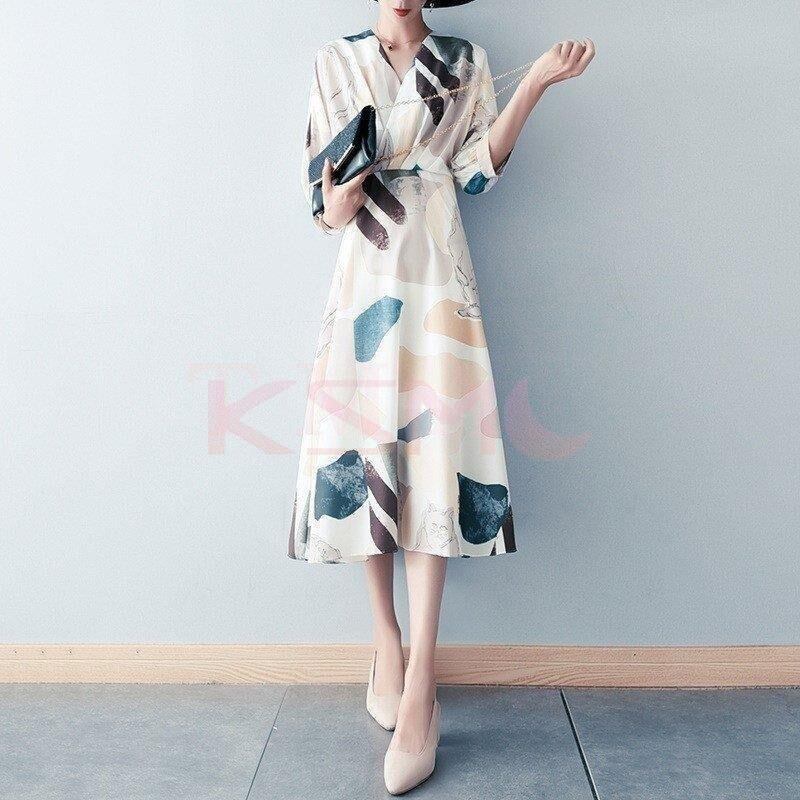 ワンピース レディース 長袖 花柄 ロングワンピース Vネック きれいめ 韓国風 7347