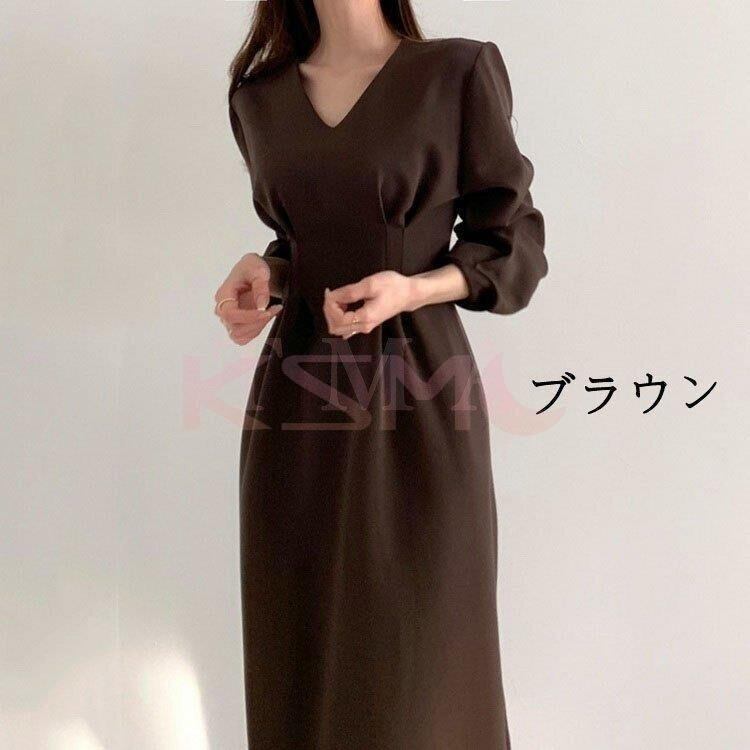 ワンピース ロングワンピース レディース 長袖 きれいめ Aライン Vネック 韓国風 7360